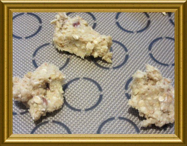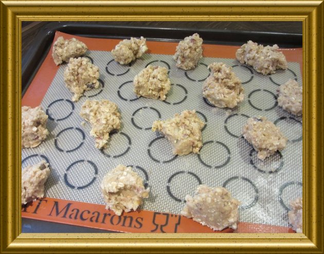 | Die Keks – Masse auf ein mit Backpapier ausgelegtes Backblech teelöffelweise verteilen. (Besser ist die Verwendung einer Backmatte).