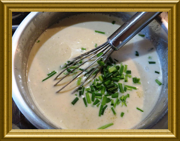 | 1 Eigelb | unterrühren, d. h. legieren. Ab jetzt nicht mehr kochen lassen! Mit | |