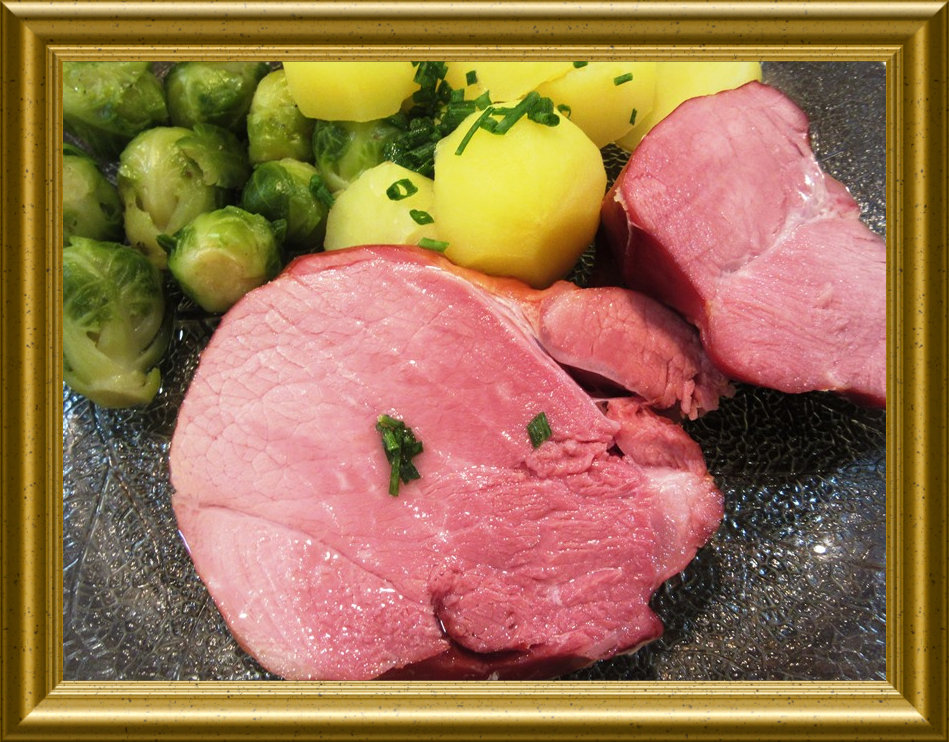 Hier das Schäufele zu Rosenkohl und Petersilienkartoffeln.