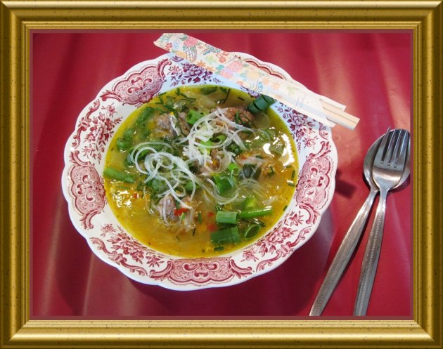 | 200 g Glasnudeln | zerbrechen und ebenfalls in die Brühe geben. | |
