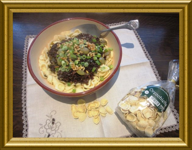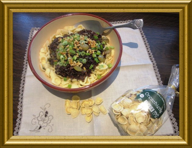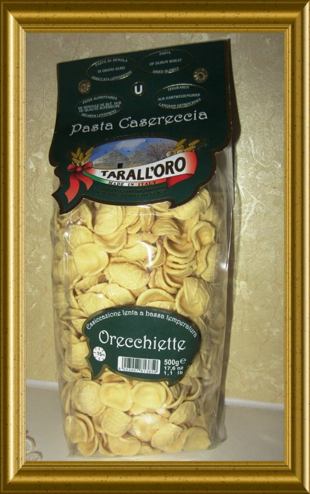 Orecchiette heisst auf italienisch: Öhrchen. Es ist eine Pasta-Art, die aus Apulien in Italien stammt. Man nennt sie daher auch Orecchiette pugliesi. Sie sind das Symbol der Stadt Bari, werden jedoch in allen Teilen Apuliens verzehrt und sind sozusagen das Nationalgericht.