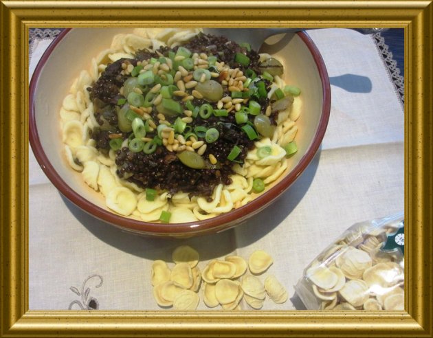 | 400 g Orecchiette Nudeln oder ähnliche | in Salzwasser al dente garen. Die gegarten Nudeln zu den Balsamicolinsen geben. | |