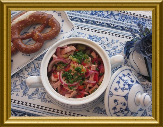 von der Pelle befreien, längs halbieren und in feine Streifen geschnitten zum Salatdressing geben. Locker unterheben. |