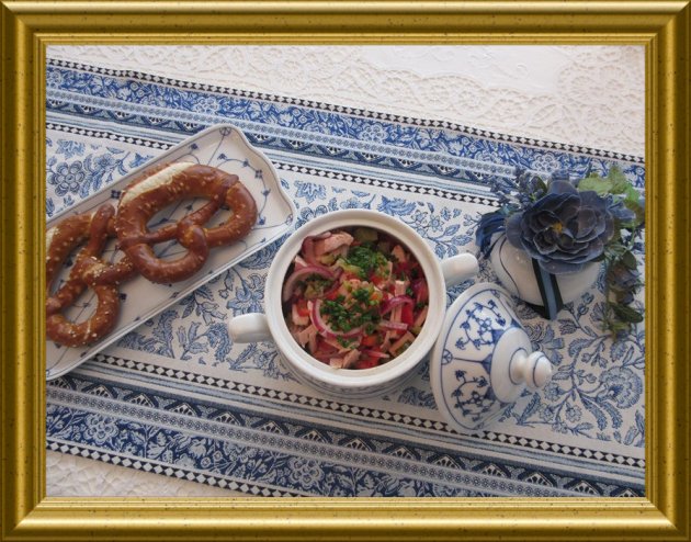 Hierzu reiche ich Laugenbrötchen oder Laugenbrezeln. |