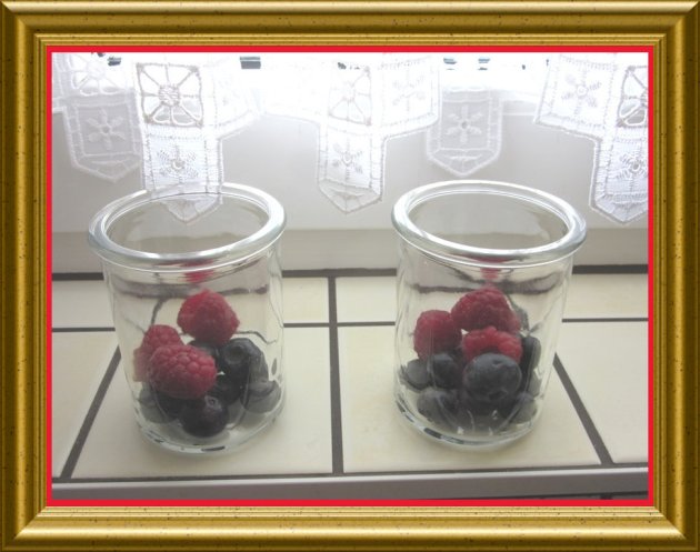 | 80 g Himbeeren | vorbereitet in kleine hitzebeständige Gläschen füllen. | |