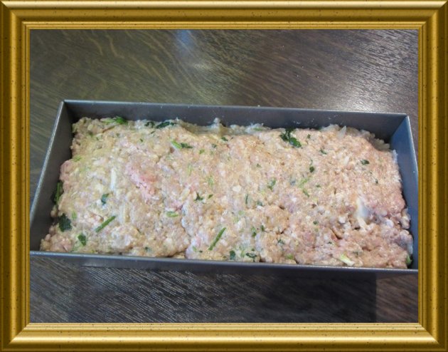 | Den gut durchgemischten Hackfleischteig zur Hälfte in eine gefettete Kastenform von 11 cm x 29 cm verteilen.