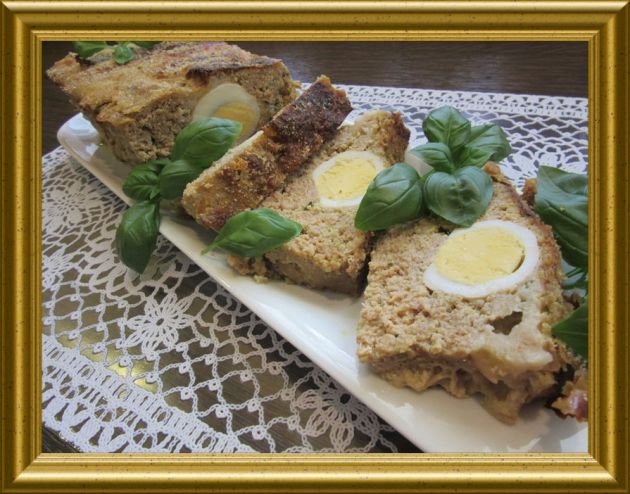 Die hartgekochten Eier in Reihe oben aufsetzen und dann mit dem restlichen Hackfleischteig gut bedecken. Festdrücken. Mit |