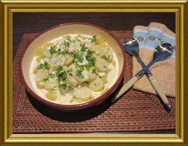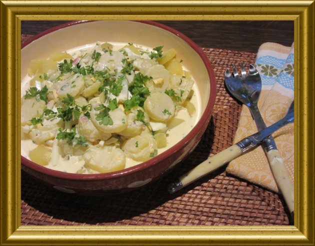 | Eier, Gewürzgurken und Kartoffeln zur lauwarmen Salatsauce geben und den Salat mind. 30 Min. abgedeckt durchziehen lassen. | ||