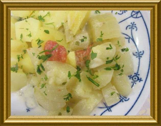 | 4 Schmorgurken | vorbereiten, schälen, längs halbieren und die Kerne herausschaben mit einem Teelöffel. Die Gurken zu Halbmonden schneiden und zu den gedünsteten Zwiebeln geben. Alles mit der abgeriebenen | |