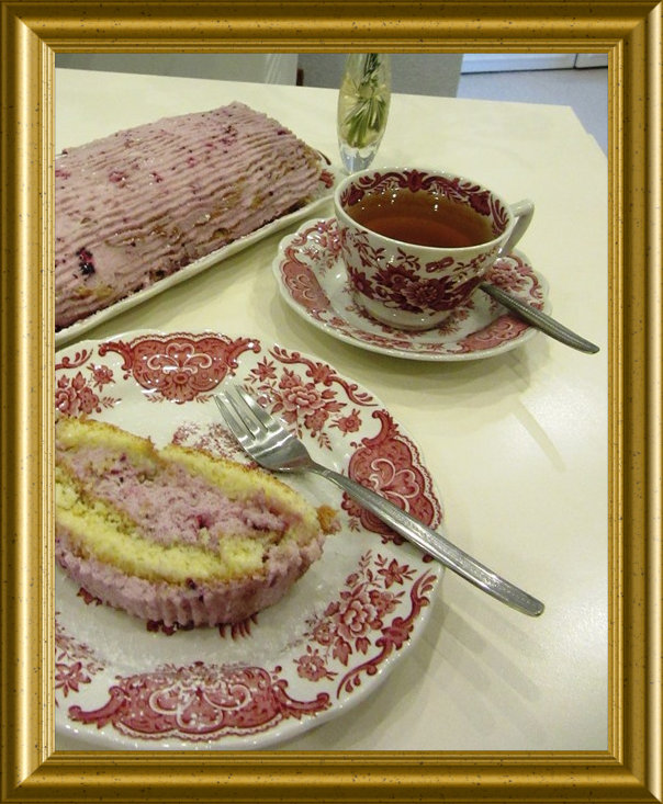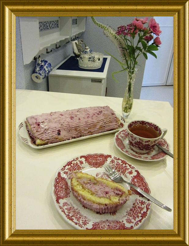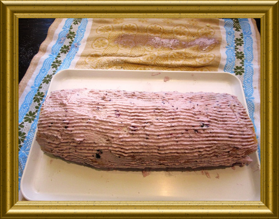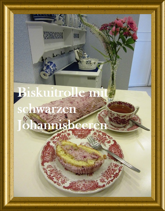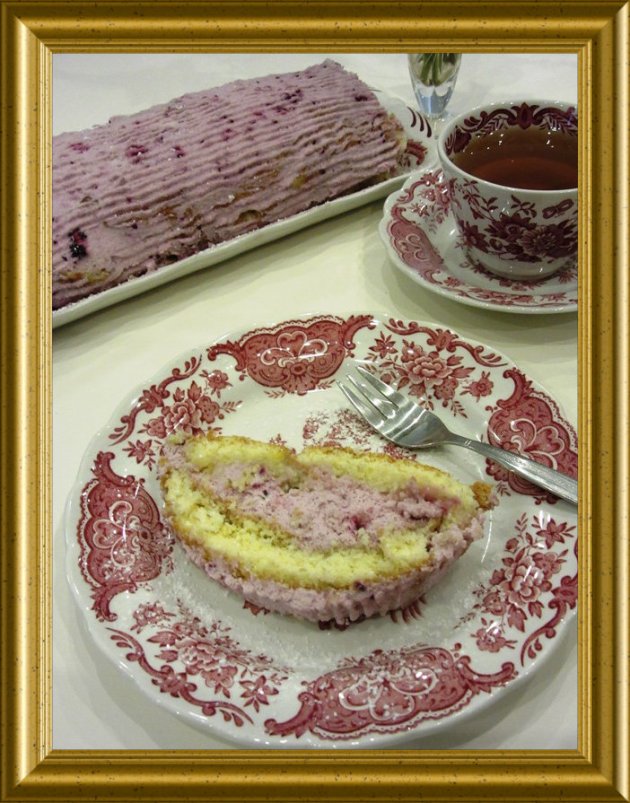 Biskuitrolle mit schwarzer Johannisbeersahne |
