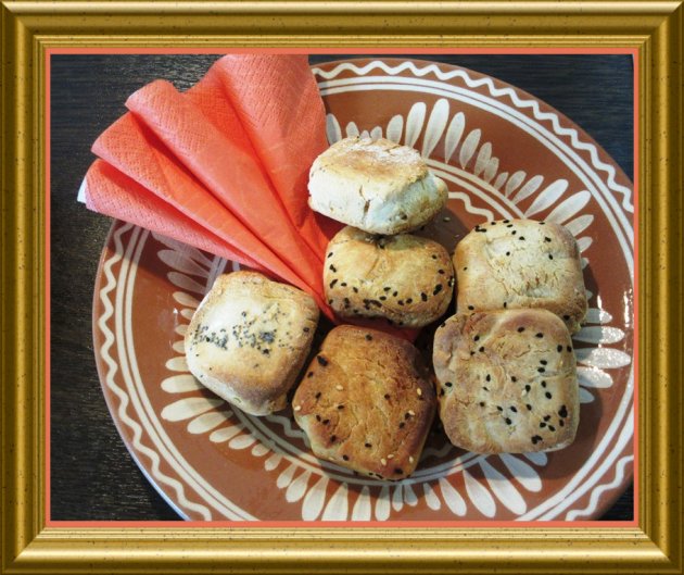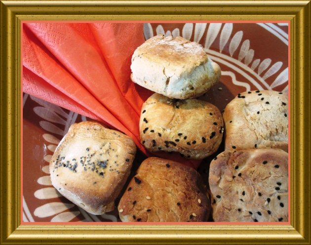 | Den Teig kurz gehen lassen und dann nach Belieben die über Kreuz eingeschnittenen Brötchenrohlinge mit | ||
