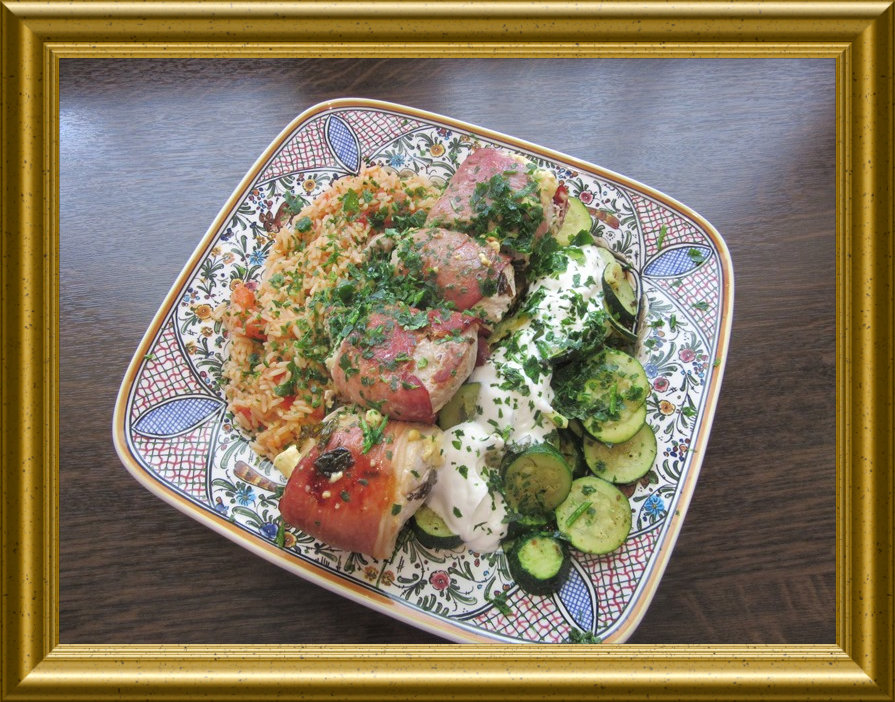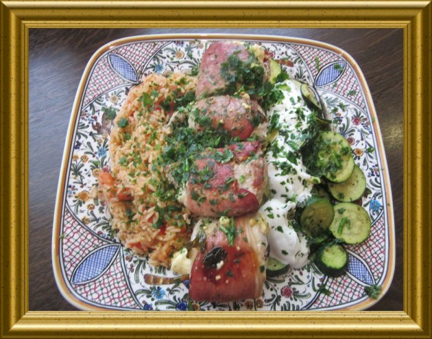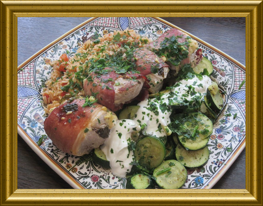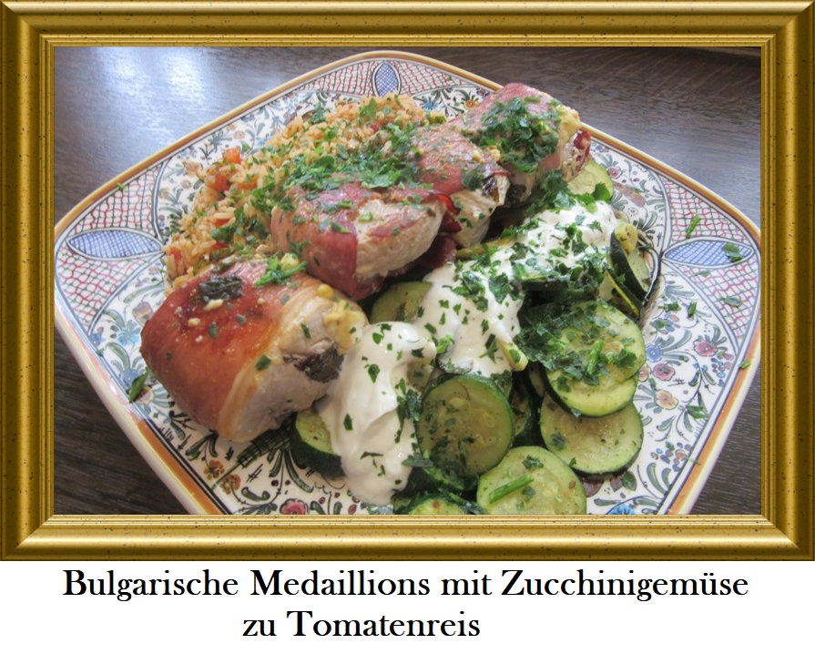 Bulgarische Medaillions mit Zucchinigemüse zu Tomatenreis