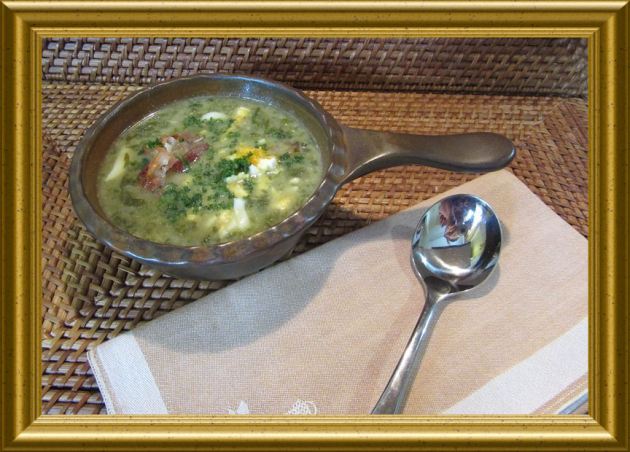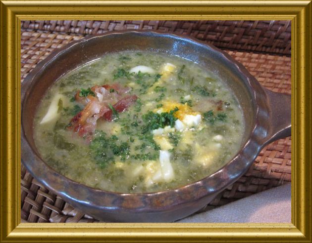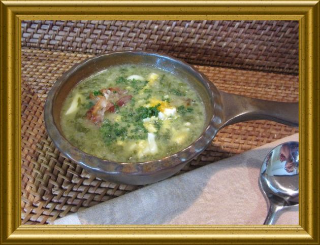 | Die crémige Suppe in Suppentassen füllen und den knusprigen Bauchspeck sowie die halbierten Eier verteilen. Die Suppe mit | ||
