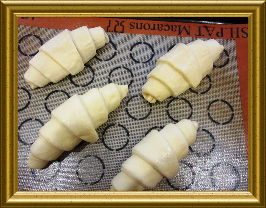 | Die Rollen zu Croissants formen und auf ein mit Backpapier ausgelegtes Backblech setzen. Ich benutze wieder eine Backmatte. | ||