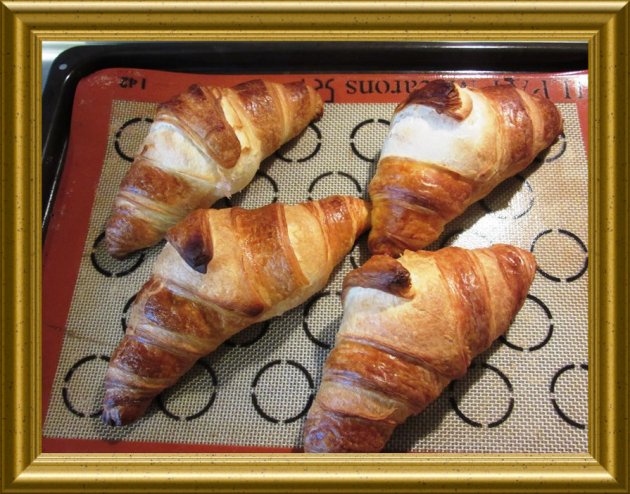| Die Vorfreude auf die Pariser Croissants beginnt. Hab immer einen Blick auf Croissants im Backofen. Nicht das sie zu dunkel werden und die Spitzen verbrennen. | ||