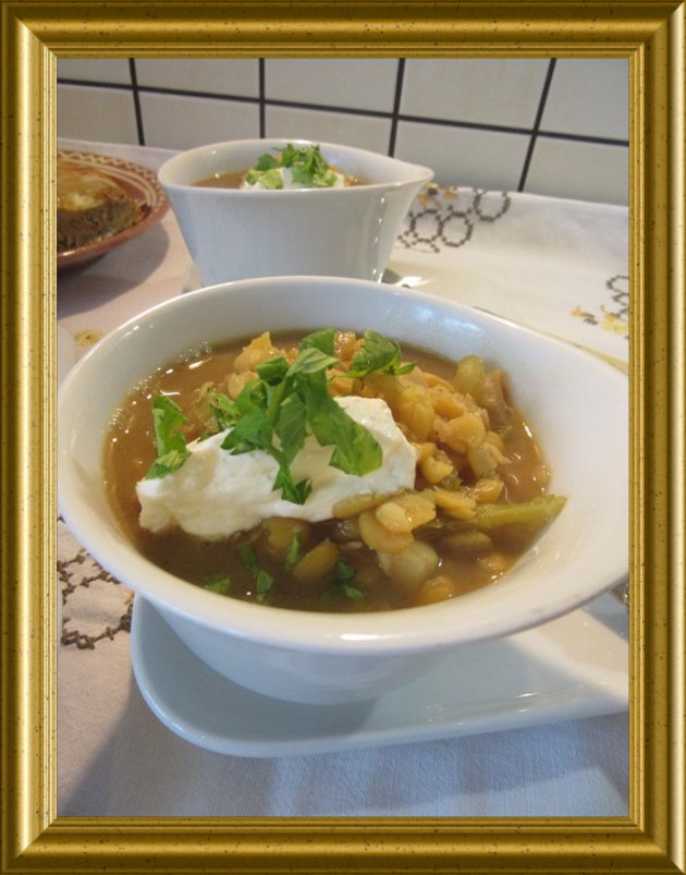 | 2 Stängel Staudensellerie | vorbereitet, in feine Scheiben geschnitten hinzufügen.Das Selleriegrün fein gehackt (etwas für die Garnitur zurückbehalten) dazu geben. Alles weitere 5 Min. bei milder Hitze garen. | |