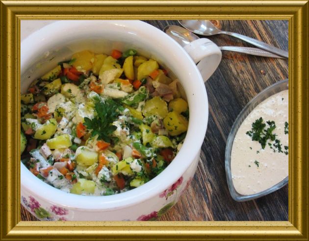 | 200 g gekochte Pellkartoffeln | von der Schale befreien, abkühlen lassen und anschliessend in mittelgrosse Stücke schneiden. Mit dem Gemüse vermischen und bereithalten. | |