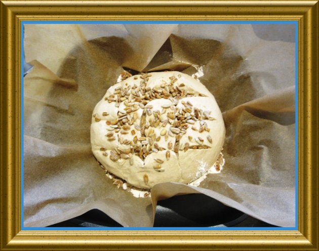 | Ein Laib Brot daraus formen und dieses auf ein mit Backpapier ausgelegtes Backblech – besser ist hier ein Schamottestein – legen.