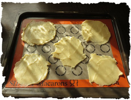 | Die Teigmasse mit einem Spatel kreisförmig dünn auf ein mit Backpapier | ||