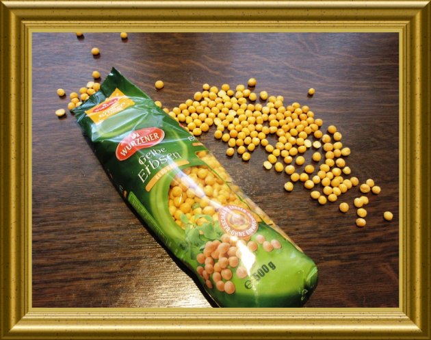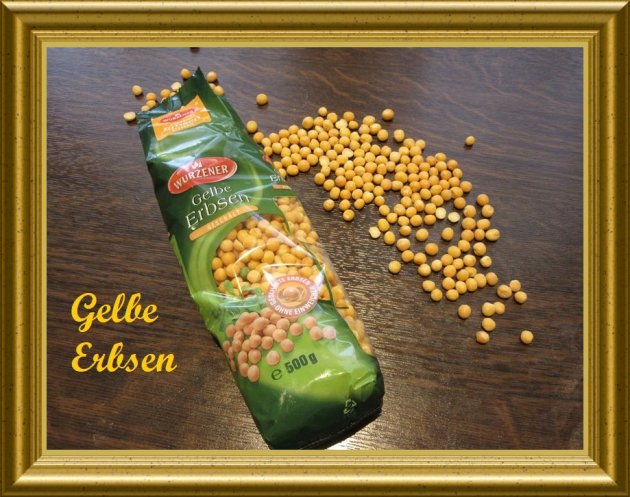 | 200 g gelbe Erbsen | darin etwa 12 Std. einweichen und anschliessend in diesem Wasser zum Kochen bringen. | |