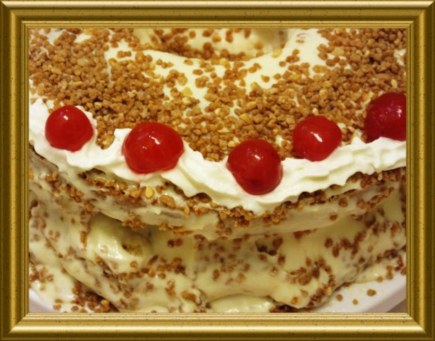 | Die Tortenböden einzeln legen. Die unterste Schicht kann bereits auf die Tortenplatte gestellt werden. Diese Schicht mit 1/4 der Créme bestreichen. Die nächste Schicht ausetzen und wieder 1/4 der Créme verteilen.