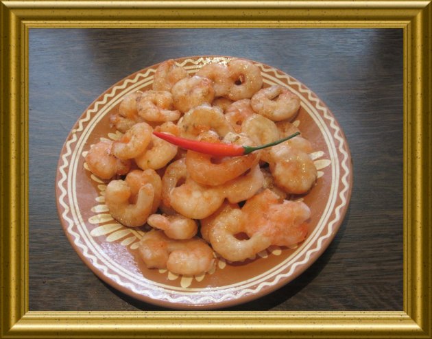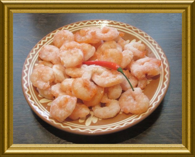 | Chili aus der Mühle oder 1 Frische Chilischote | entkernt, halbiert, fein gehackt huinzufügen. Die Garnelen darin 5 Min. einlegen. | |