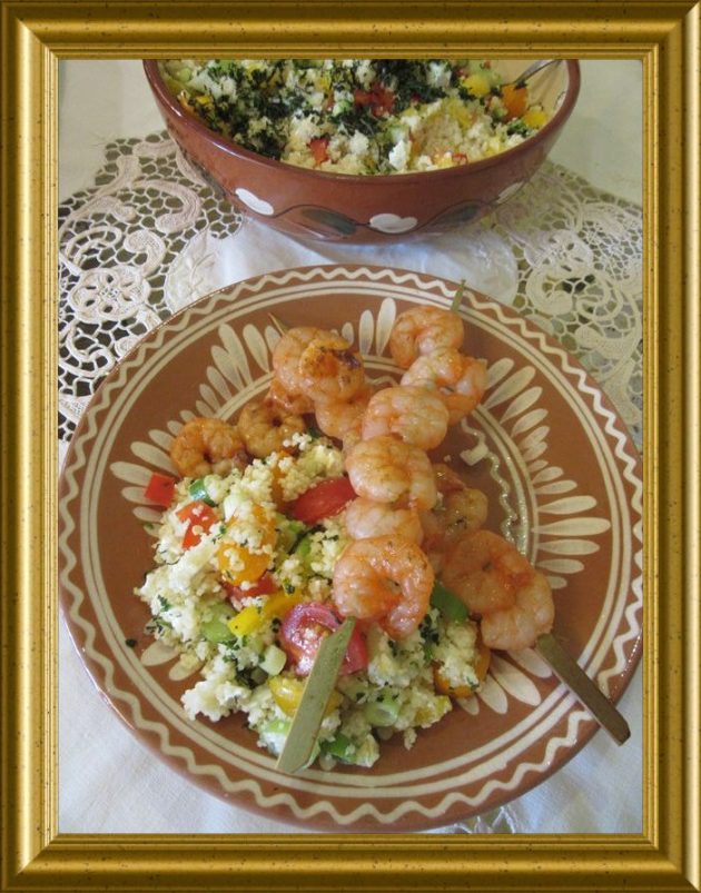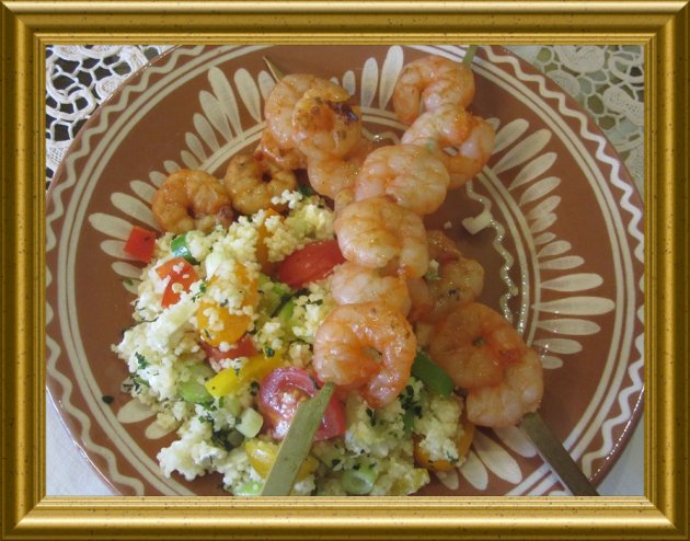 | Danach je zwei Garnelen entgegengesetzt zueinander aufspiessen. | ||
