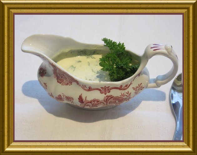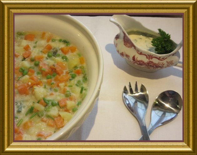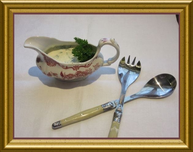 Die Kräutercréme kann auch als Dip für Gegrilltes oder andere Salate als Dressing verwendet werden! Auch zu Fischstäbchen ist die Créme eine Alternative zu Remouladensauce. |