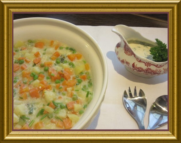 | 500 g Kartoffeln – festkochende Sorte- | in Stifte oder Würfel geschnitten nicht zu weich in Salzwasser garen. Das Gemüse danach durch ein Sieb giessen und bereithalten. | |