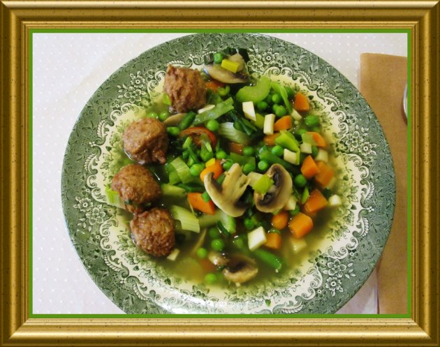 | Ersatzweise oder zusätzlich können gegarte Fleischklösschen als Einlage verwendet werden.