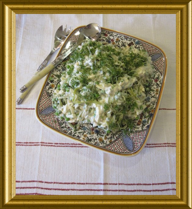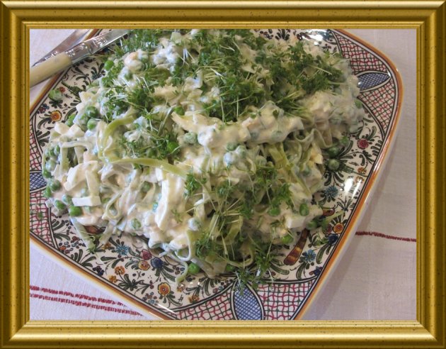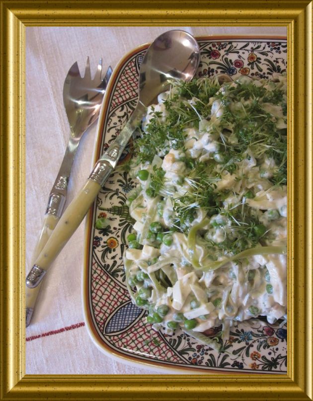 | 300 g TK-Erbsen | kurz im kochenden Salzwasser garen. Durch ein Sieb geben und zur Salatsauce geben. | |