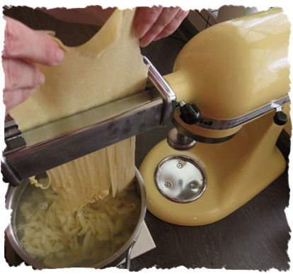 | vom Bandnudelaufsatz der Küchenmaschine in das kochende Wasser. | ||