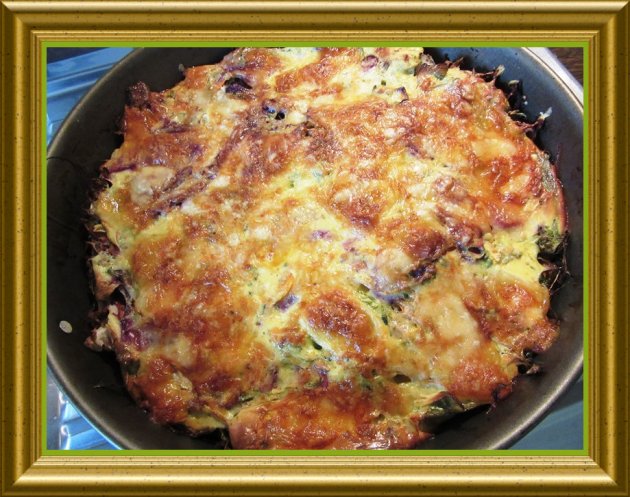 Pastetenteig, Zwiebeln, Bündner Fleisch, viel Käse und Eier |