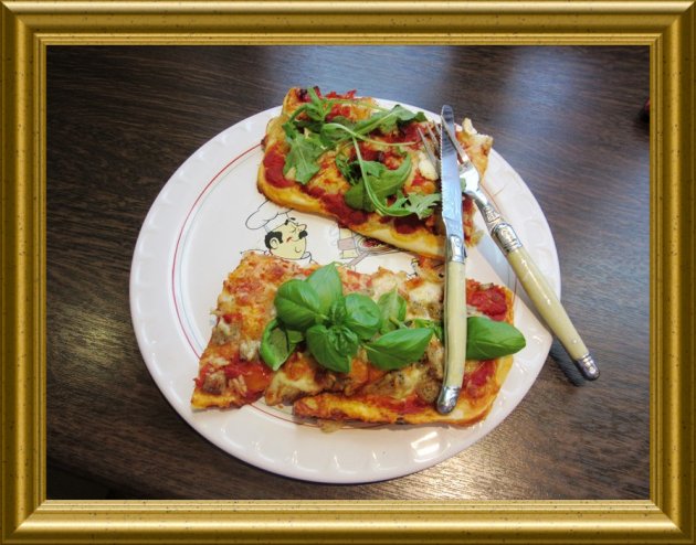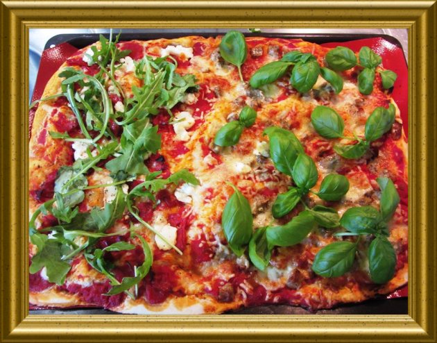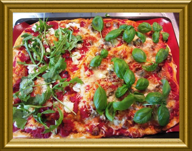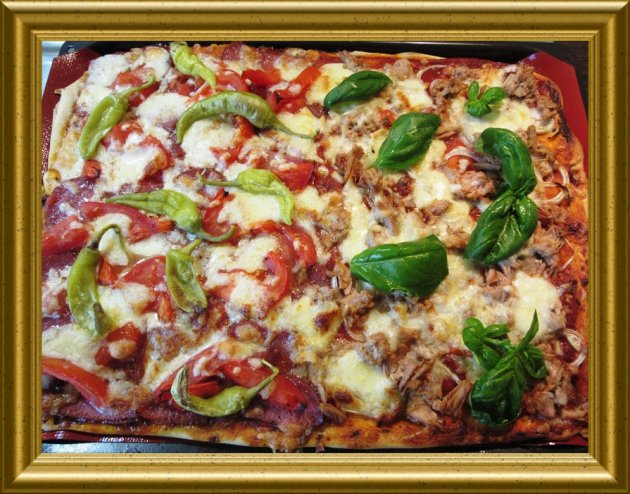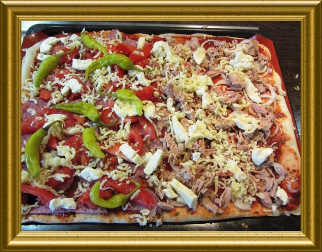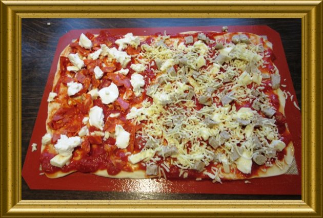 | Nach Belieben kann die Pizza nun belegt werden. | ||