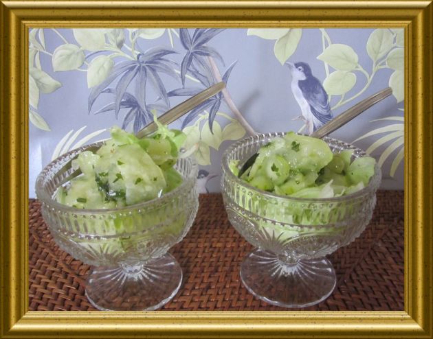 | 1 TL Salz | vermengen und kurz stehen lassen. Danach die Gurkenscheiben abgiessen und in das Dressing geben. | |