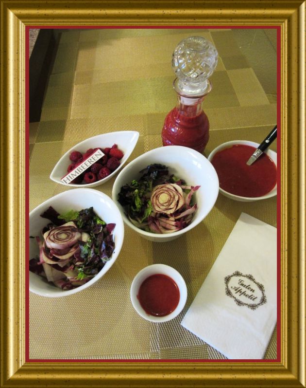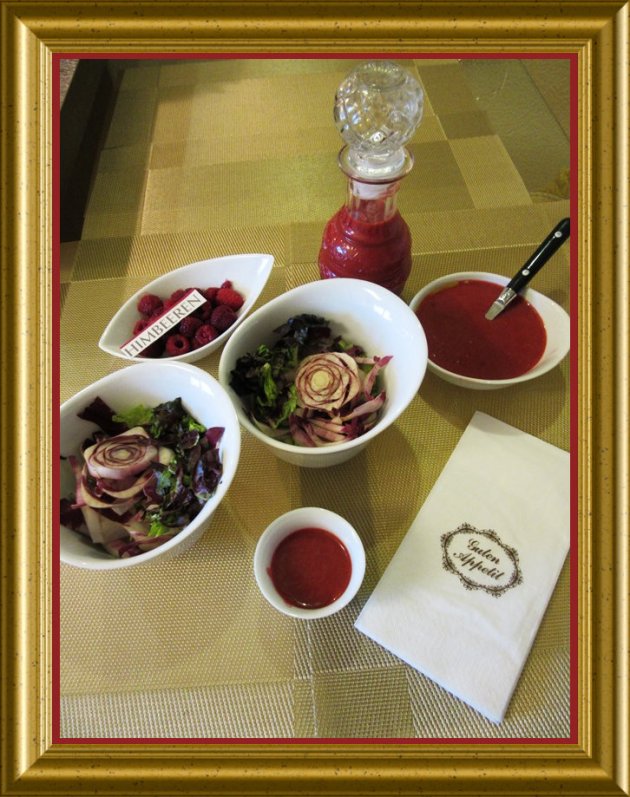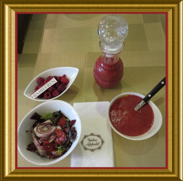 | weissen Pfeffer aus der Mühle | abschmecken und mit dem Himbeermark vermischen.
