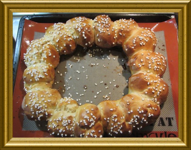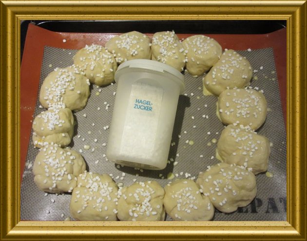 | Danach den Teig noch einmal kräftig durchkneten auf einer leicht bemehlten Arbeitsfläche. Aus dem Teig 12 bis 15 gleich grosse Kugeln formen. Diese Kugeln in einem Kranz dicht an dicht oder einfach aneinander zu einem Kreis auf ein mit Backpapier ausgelegtes Backblech legen. | ||