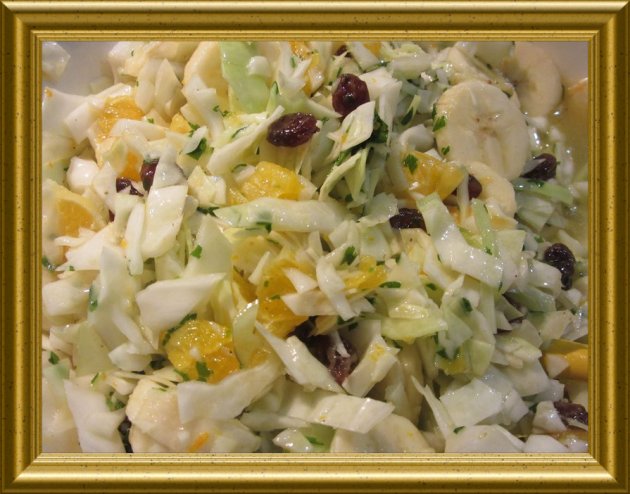 schälen und in feine Scheiben schneiden. Die Bananenscheiben locker mit den anderen Salatzutaten vermengen. Nun das Dressing darübergiessen. Den Salat zugedeckt ca. 1 Std. ziehen lassen. |