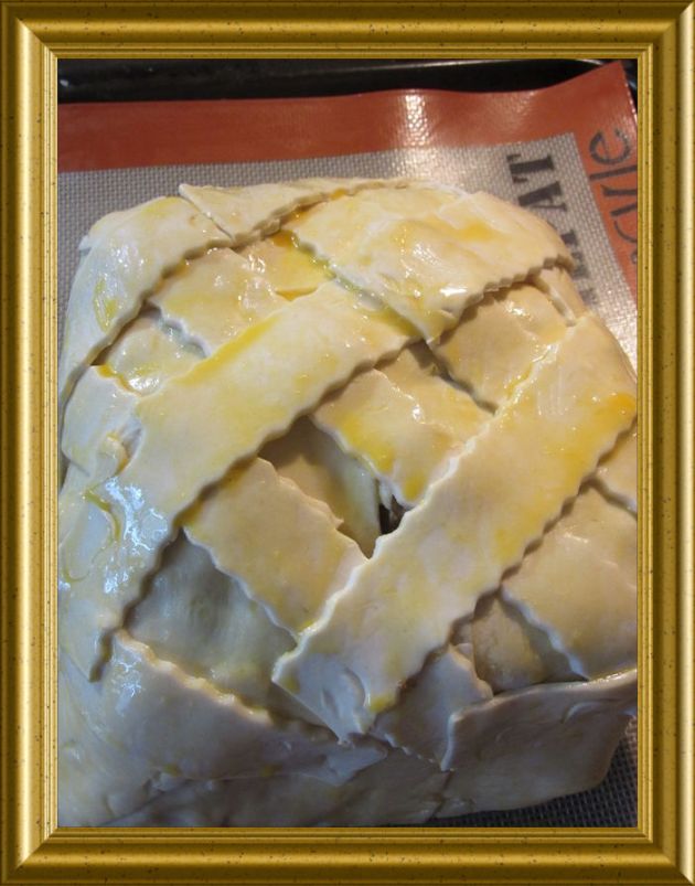 Den restlichen Blätterteig in Streifen schneiden und über Kreuz auf der Blätterteighülle auflegen. Leicht festdrücken. |