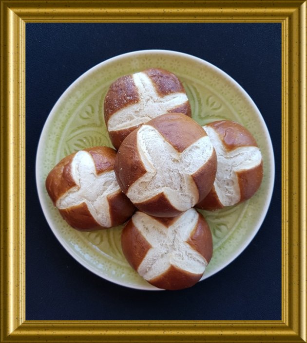 | Danach werden die Teigbrötchen mit einem scharfen Messer kreuzweise eingeschnitten. | ||