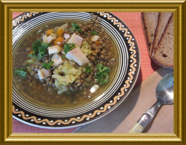 Linsen-Spitzkohl-Topf mit Räucherfisch |