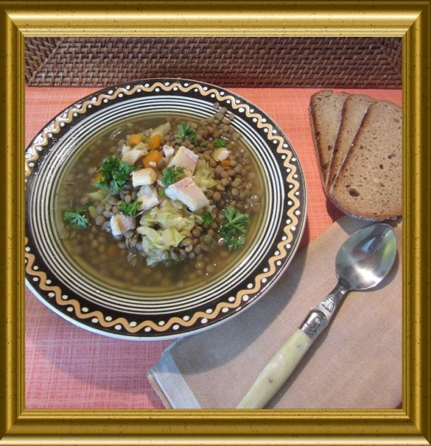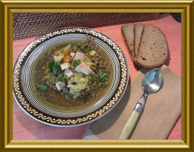 | 200 g Räucherfisch (Makrele oder Forelle) | gehäutet, entgrätet und zerpflückt zum Kohlgemüse geben und erwärmen. Nun die gegarten Linsen mit dem Suppengrün und der Gemüsebrühe dazugeben. Alles miteinander vermischen und mit | |