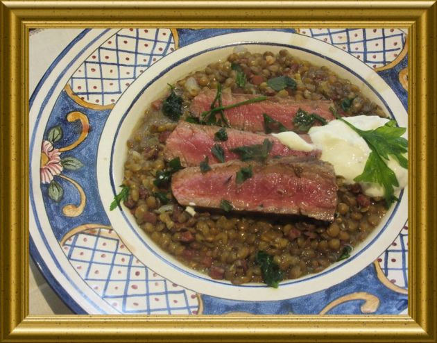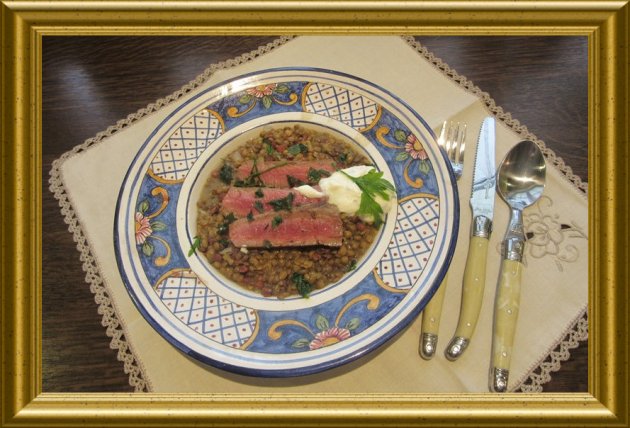 Linsensuppe mit Steakstreifen |