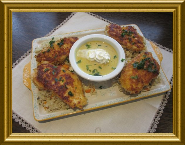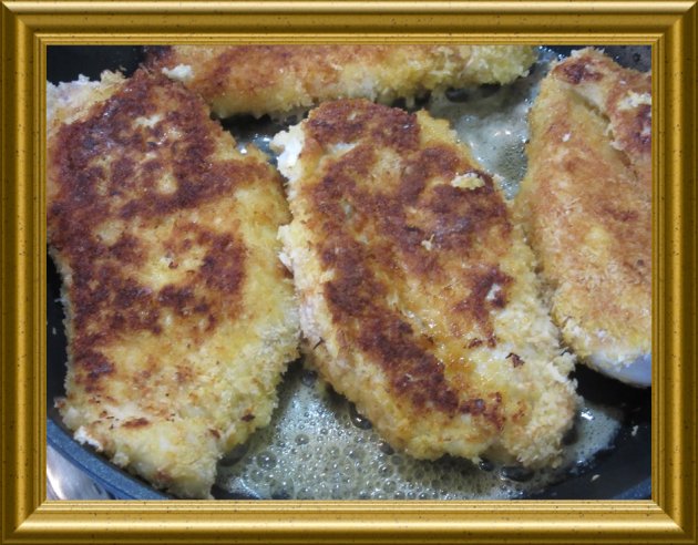 | 3 EL Olivenöl | wird das panierte Geflügel langsam golgelb angebraten. | |