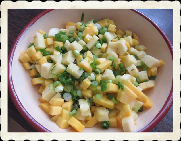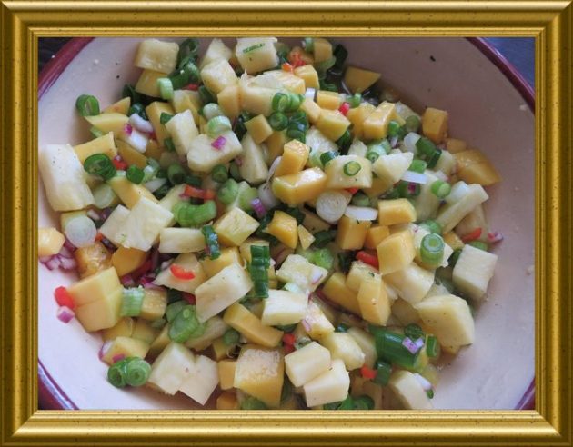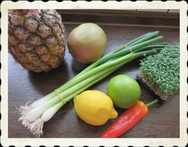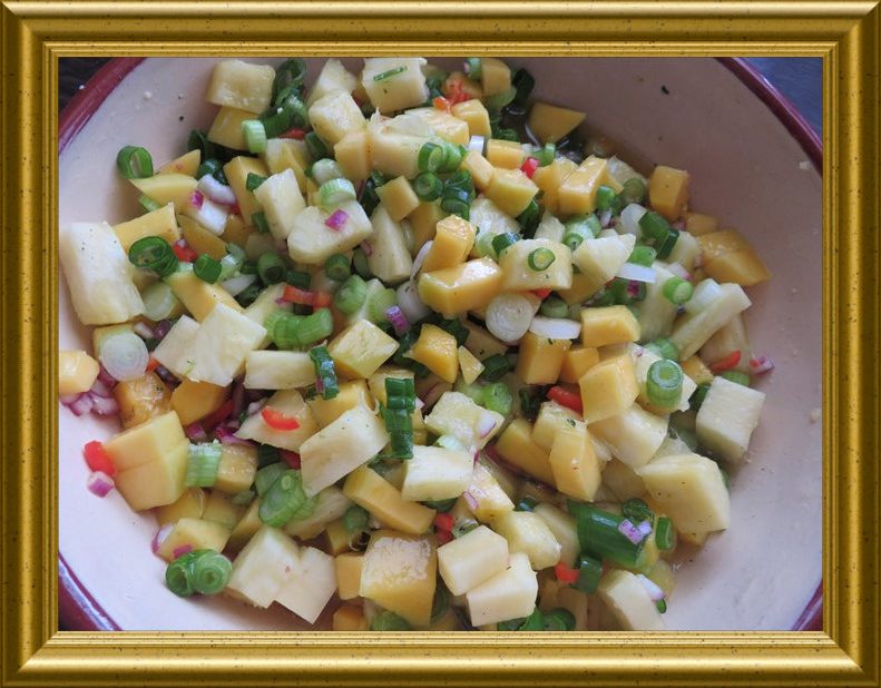 | 1 kleine Ananas (Baby-Ananas) | schälen, längs vierteln und den harten Teil des Strunks entfernen, in feine Würfel schneiden und | |