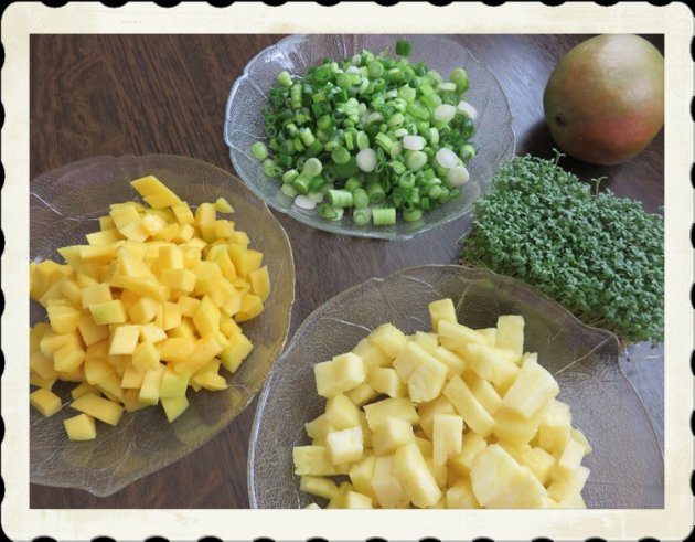 | 1 reife Mango | entkernen, schälen und in kleine Würfel schneiden sowie | |