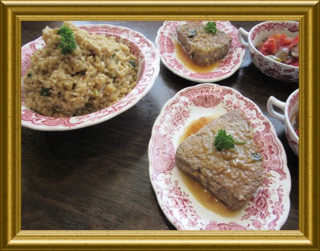 | 4 Scheiben Rinderfilet (à 150 g) | in die Marinade legen, gut bedecken und mind. 30 Min.ziehen lassen. | |