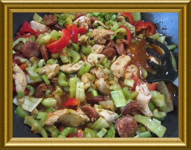 | Neben Reis und diversen Fleischeinlagen besteht meine Jambalaya vor allem aus der Holy Trinity, der sogen. Heiligen Dreifaltigkeit der Cajun-Küche, die da sind: