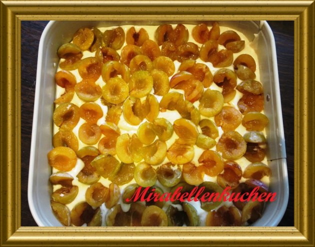Die so vorbereiteten Mirabellen auf dem Teig verteilen und etwas eindrücken. |