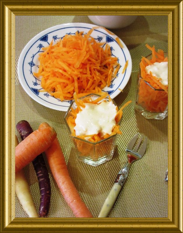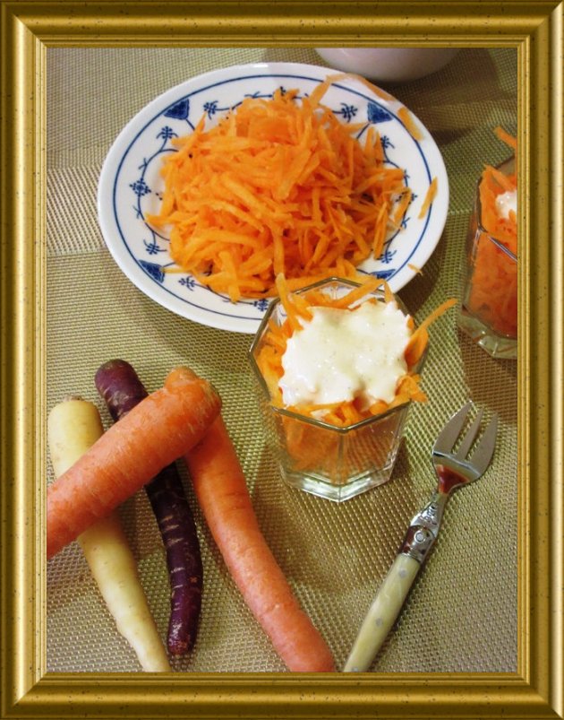 | 500 g bunte Mohrrüben | geschält und fein geraspelt geben. Locker untermischen. | |